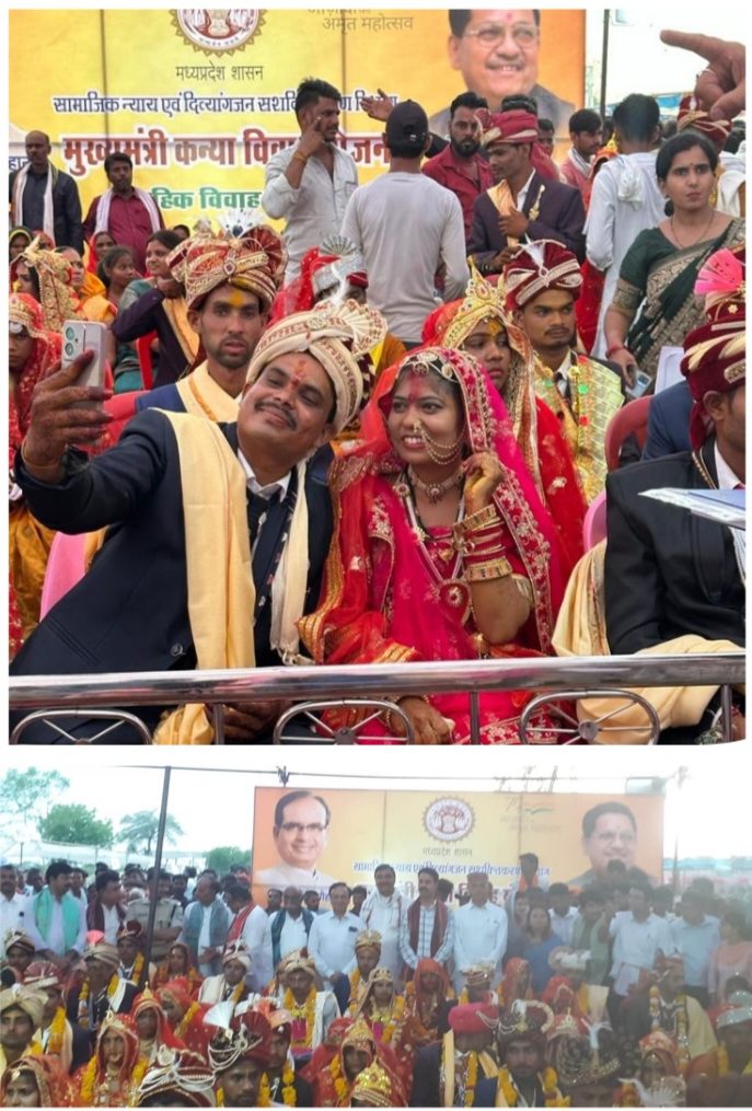 मुख्यमंत्री कन्या विवाह योजना के अंतर्गत बाड़ी जनपद की ग्राम पंचायत नयागांव में आयोजित सामूहिक विवाह कार्यक्रम में 62 जोड़ों का विवाह सम्पन्न हुआ। मुख्यमंत्री श्री शिवराज सिंह चौहान द्वारा वर्चुअली सभी जोड़ों को आर्शीवाद दिया गया तथा उपस्थित जनसमूह को संबोधित किया गया। साथ ही मिशन लाइफ अंतर्गत सभी जोड़ों, जनप्रतिनिधियों, अधिकारियों तथा नागरिकों को पर्यावरण संरक्षण की शपथ दिलाई गई।
