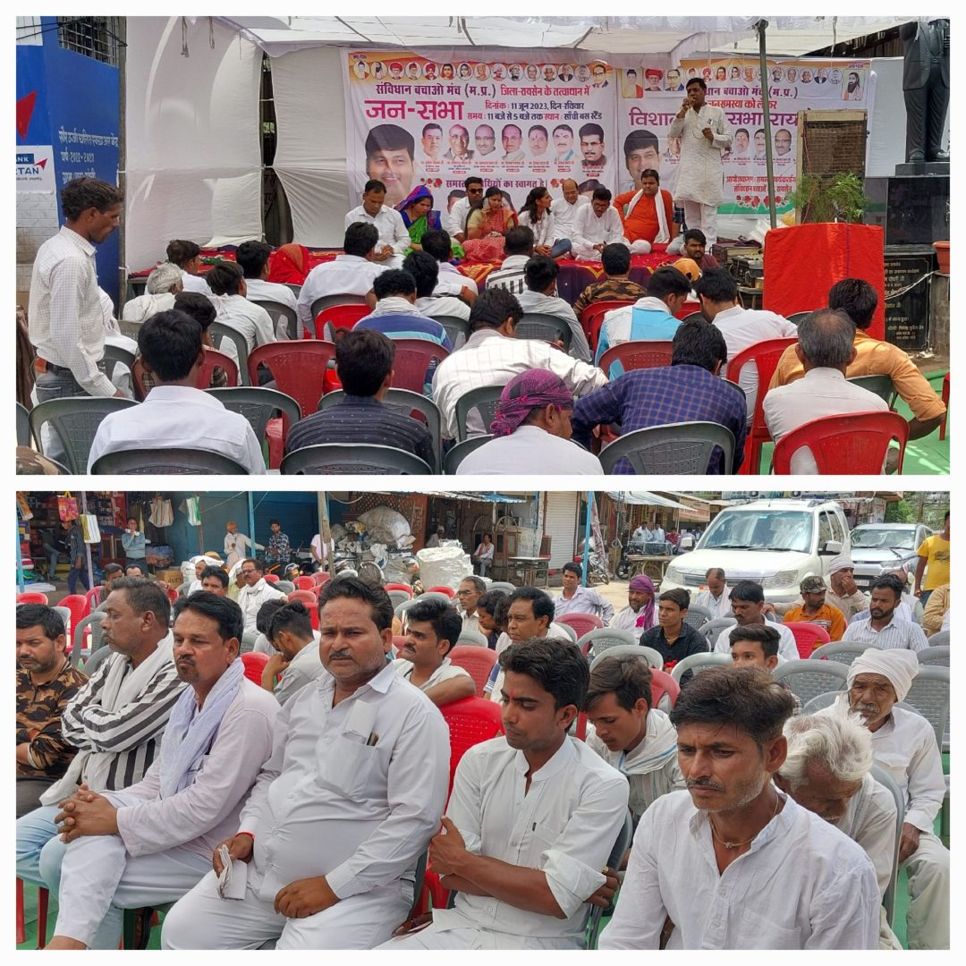 जानकारी के अनुसार नगर के बसस्टेंड परिसर में आज दोपहर भरदोपहर कड़कड़ाती गर्मी में संविधान बचाव मंच के बेनर तले जनसभा का आयोजन किया गया इस अवसर पर कार्यक्रम में मौजूद वक्ताओं ने अपने अपने विचार व्यक्त किये इस अवसर पर वक्ताओं ने कहा आज संविधान मिटाने की लगातार कोशिश चल रही है तथा लोगों को जाती धर्म के आधार पर बांट दिया गया है आपस मे नफरत पैदा कर दी गई है भाजपा सरकार में प्रदेश में अपराधियों का बोलबाला है कानून नाम नहीं रहा बहनों के भाई मामा कहलाने वाले मुख्यमंत्री के कार्यकाल में बहनों पर लगातार अत्याचार बढ़ रहे हैं सड़कों पर महिलाओं की सुरक्षा नहीं हो पा रही है पुलिस थानों में बिना पैसे के रिपोर्ट नहीं लिखी जाती तथा मंहगाई चरम पर पहुंच गई है सरकार की बागडोर अमीर लोगों के हाथों सौंपने की कवायद जोरशोर से जारी है अच्छे दिनों का सपना दिखाने वाली सरकार ने लोगों के जीवन से खिलवाड़ कर दिया है कालाधन वापस लाने के नाम पर आम जनता पर नोटबंदी का खेल भारतीय करेंसी के साथ खेलना शुरू कर दिया गया है जीएसटी लागू कर व्यापारियों के धंधे चौपट कर दिये । विकास के नाम पर दिखावा किया जा रहा है भ्रष्टाचार चरम पर नीचे से ऊपर तक पहुंच गया है विकास के नाम पर सरकार की लाखो करोड़ो रुपए की राशि को चूना लगाया जा रहा है इस अवसर पर वक्ताओं ने कहा कि अच्छे दिनों का सपना दिखाने वाले हमारे पुराने दिनों को ही लौटा दें जनता दर-दर भटकने पर मजबूर हो रही है संविधान की खुलेआम धज्जियां उड़ाई जा रही है आज समय आ गया है हमें संविधान को बचाने आगे आना पड़ेगा तथा संविधान की रक्षा के लिए हमें प्रयास करना पडेगे भाजपा शासित राज्यों में गैस साढ़े ग्यारह सौ रुपए है जबकि कांग्रेस शासित राज्यों में यही गैस पांच सौ रुपए में दी जा रही है किसानों के साथ धोखा दिया जा रहा है मजदूर वर्ग परेशान हैं भाजपा ने दो करोड़ युवाओं को रोजगार देने का वायदा किया किसानों को उचित दाम देने का वायदा कालाधन वापस लाकर गरीबों में बांटने का वायदा किसानों के ऋण माफी का वायदा सभी झूठे साबित हो चुके हैं बल्कि जनता से ही लूट-खसोट चल रही है ऐसी भ्रष्टाचारी सरकार झूठै वायदे करने वाली सरकार को सबक सिखाने का समय आने वाले विधानसभा चुनाव में भाजपा सरकार को उखाड़ फेंककर सत्ता से बाहर करने का आ गया है कांग्रेस की सरकार बनना सुनिश्चित हो चुका है पहलवान लड़कियों को हड़ताल पर बैठने मजबूर होना पड़ रहा है अपराधियों को खुली छूट दी गई है इस बीच वक्ताओं ने इस नगर के बसस्टेंड परिसर में बनने वाली सड़क का विवादित मुद्दा भी उठाया तथा कहा भाजपा विकास की बड़ी बड़ी धींगे भरते नहीं थक रही इस नगर की बसस्टेंड पहुंच मार्ग में भाजपा के ही पार्षदों ने अड़ंगा लगा कर सड़क निर्माण राशि को वापस सर