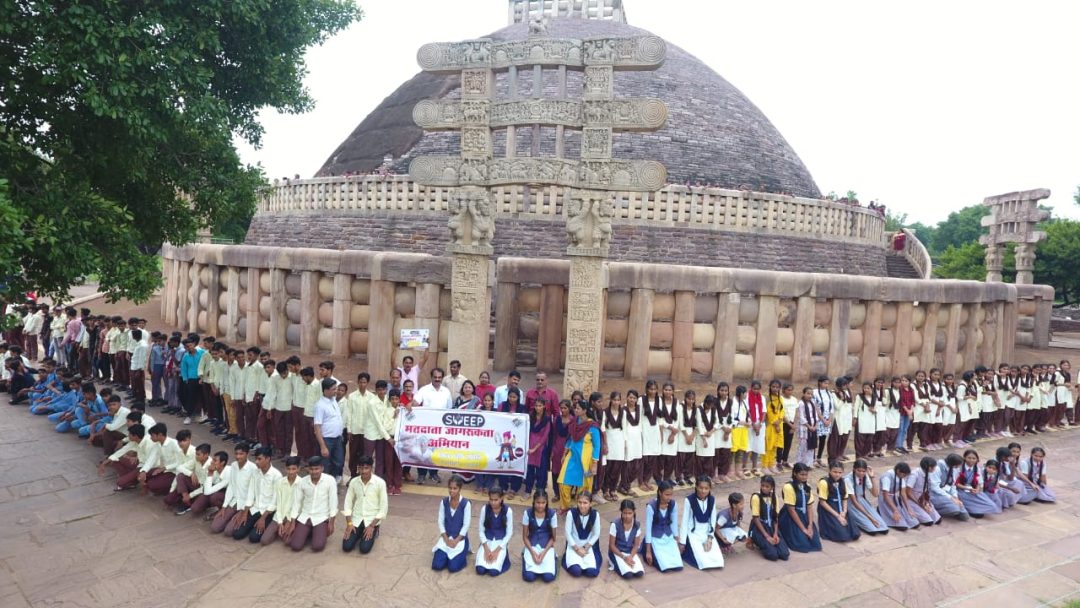 जिले में आगामी विधानसभा निर्वाचन-2023 में शत-प्रतिशत मतदान हेतु मतदाताओं को प्रेरित करने के लिए कलेक्टर एवं जिला निर्वाचन अधिकारी श्री अरविंद दुबे के निर्देशानुसार सम्पूर्ण जिले में मतदाता जागरूकता गतिविधियां आयोजित की जा रही हैं। इसी कड़ी में जिला पंचायत सीईओ तथा स्वीप नोडल अधिकारी श्रीमती अंजू पवन भदौरिया के निर्देशन में बुधवार को विश्व धरोहर सांची स्तूप परिसर से 350 से अधिक स्कूली छात्र-छात्राओं ने मानव श्रृंखला बनाकर मतदान का महत्व बताते हुए मतदाता जागरूकता का संदेश दिया।