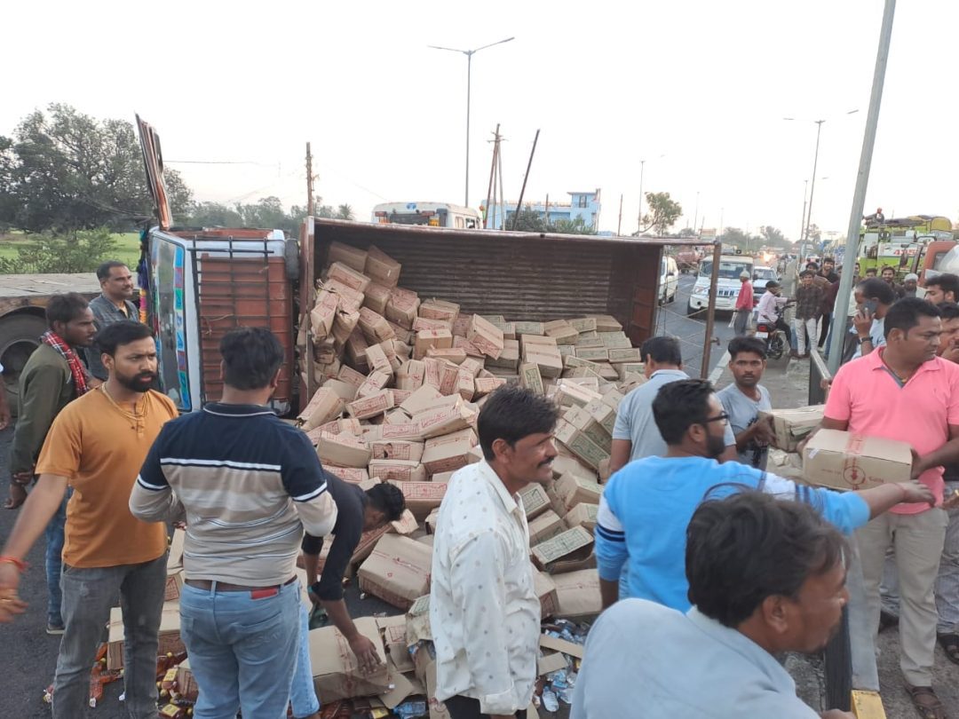 सांची, शराब ठेकेदार द्वारा शराब कंपनी सांची के लिए भेजी गई देसी शराब से भरा मिनी ट्रक शाम करीब 6:बजे टायर फट जाने के कारण राष्ट्रीय राजमार्ग 146 पर पुरातत्व कॉलोनी के सामने अचानक पलट गया घटना में चालक एवं एक अन्य व्यक्ति घायल हुआ है ट्रक में भरा माल सड़क पर बिखर गया सूचना मिलते हैं थाना प्रभारी एवं पुलिस बल मौके पर पहुंच गया था घायलों को अस्पताल पहुंचाया गया एवं में रोड से ट्रक को हटाने की कार्यवाही शुरू कर दी गई पुलिस से प्राप्त जानकारी के अनुसार माल सोम कंपनी का था जो सांची स्थित दुकान पर लाया जा रहा था राष्ट्रीय राजमार्ग पर जाम लगने के कारण ट्रैफिक को सर्विस रोड के माध्यम से निकाला गया है पुलिस प्रशासन व्यवस्था में जुटा रहा। शराब के शौकीन लोगों ने बिखरी पड़ी शराब पर खूब लूट मचाई । पुलिस के आने के बाद बिखरी पड़ी शराब भी सुरक्षित हो सकी। तथा लोगों की भीड़ का जमावड़ा लगा रहा । आवागमन बाधित हो गया जिसे दुर्घटना ग्रस्त वाहन को सड़क से हटा कर आवागमन सुचारू बनाया गया।