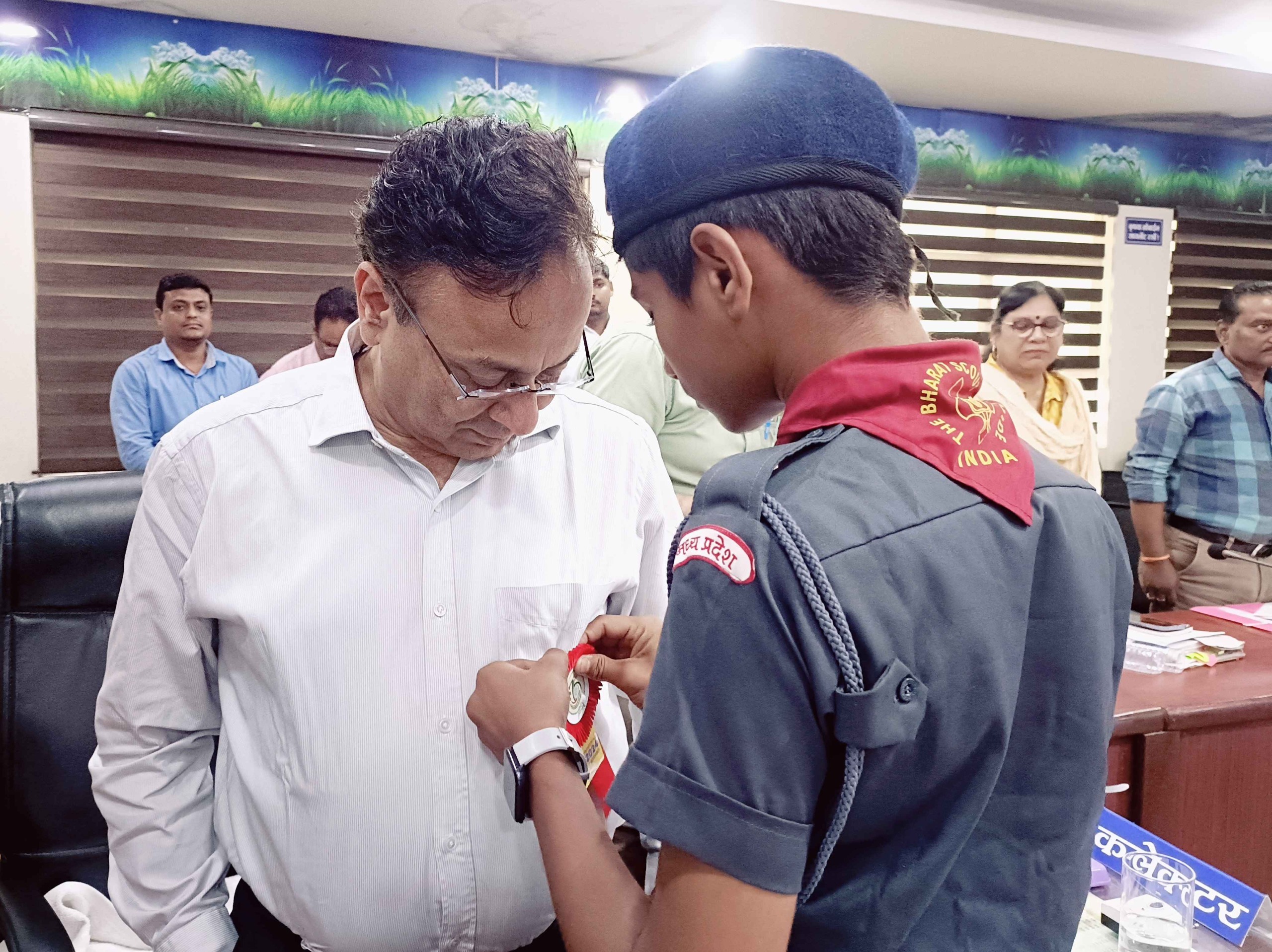 भारत स्काउट्स एण्ड गाइड्स के स्थापना दिवस के अवसर पर कलेक्टर श्री अरविंद दुबे से स्काउट गाइड, शिक्षक एवं विद्यार्थियों ने भेंट की। इस अवसर पर बच्चों ने कलेक्टर श्री दुबे को स्काउट गाइड का फ्लैग लगाया। कलेक्टर श्री दुबे ने स्काउट गाइड संगठन को सहयोग राशि प्रदान की। उन्होंने स्काउट गाइड संगठन को शुभकामनाएं देते हुए कहा कि स्काउट गाइड के जरिए बच्चों में अदम्य साहस और कर्तव्यनिष्ठा की भावना विकसित होती है। स्काउट गाइड संगठन का मूल उद्देश्य देश के लिए अच्छे नागरिक तैयार कर समाज सेवा के लिए नव युवक-युवतियों को तैयार करना है। कलेक्टर श्री दुबे ने बच्चों से कहा कि राष्ट्र प्रेम, अनुशासन व समाज सेवा की जो भावना स्काउट-गाइड में देखने को मिलती है, वह सराहनीय है। बच्चों द्वारा जिला पंचायत सीईओ श्रीमती अंजू पवन भदौरिया सहित अन्य अधिकारियों को भी स्काउट गाइड का फ्लैग लगाया गया।