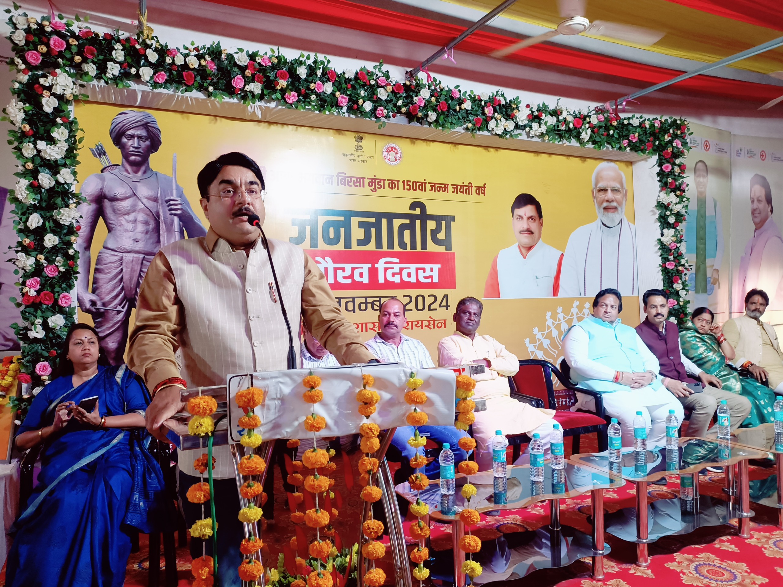 सभी धरती आबा भगवान बिरसा मुण्डा के बताए मार्ग पर चलें- भोजपुर विधायक श्री पटवाइस अवसर पर भोजपुर विधायक श्री सुरेन्द्र पटवा ने अपने उद्बोधन के प्रांरभ में धरती आबा भगवान बिरसा मुण्डा का 150वां जन्म जयंती वर्ष पर उन्हें नमन करते हुए कहा कि हम सभी उनके बताए मार्ग पर चलने का कार्य करें। आज पूरे देश में प्रधानमंत्री श्री नरेन्द्र मोदी के नेतृत्व में पूरे देश में जनजातीय गौरव दिवस मनाया जा रहा है। उन्होंने कहा कि जनजातीय गौरव दिवस का आयोजन जनजातियों की जिंदगी बदलने का अभियान है। यह जनजातियों के कल्याण, सम्मान एवं गौरव के लिए सरकार द्वारा लिया गया संकल्प है। उन्होंने कहा कि सरकार की सभी योजनाओं को धरातल पर उतारने का काम किया जा रहा है। सरकार द्वारा भौगोलिक विकास करने के साथ ही सामाजिक रीति-रिवाज, संस्कृति, परम्परा को आगे बढ़ाने का काम भी किया जा रहा है। जनजातीय वर्ग ने अपनी विरासत और संस्कृति को बचाने का काम किया है। उन्होंने कहा कि हमारे जिले में लगभग 92 ग्रामों में लगभग 15 हजार जनजातीय परिवारों तक सरकार की योजनाओं का लाभ पहुंचाने का काम किया जा रहा है। कार्यक्रम में जिला पंचायत अध्यक्ष श्री यशवंत मीणा, नगर पालिका अध्यक्ष श्रीमती सविता सेन तथा समाजसेवी श्री राकेश शर्मा ने भी संबोधित किया।