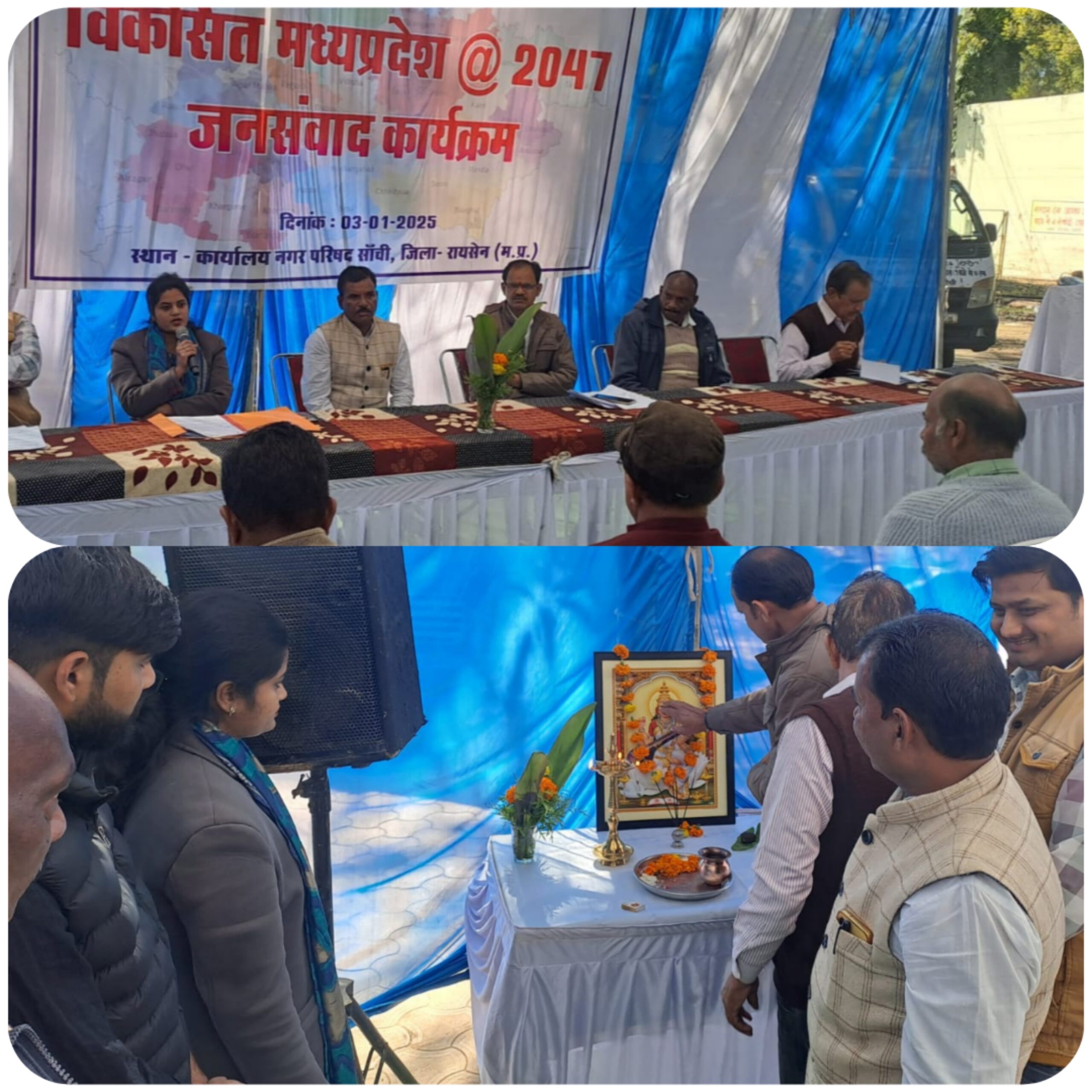 आज नगर परिषद परिसर में शासन के निर्देशानुसार विकसित भारत 2047 को लेकर नगर के गणमान्य बुद्धि जीवियों को आमंत्रित कर जनसंवाद कार्यक्रम आयोजित किया गया इस कार्यक्रम का शुभारंभ मा सरस्वती के चित्र पर दीप प्रज्वलित कर किया गया ।इस कार्यक्रम में प्रमुख रूप से अतिरिक्त तहसीलदार नियति साहू नगर परिषद अध्यक्ष पप्पू रैवाराम उपाध्यक्ष राजेंद्र सिंह राजपूत सीएमओ रामलाल कुशवाहा सहित पार्षद उपस्थित हुए ।इस कार्यक्रम की विस्तार से जानकारी देते हुए अतिरिक्त तहसीलदार श्रीमती साहू ने विकसित भारत 2047 के विजन की जानकारी उपलब्ध कराई उन्होंने कहा कि इस विकसित भारत विजन मे सभी लोग अपने अपने सुझावों को रख सकते है तथा इसमे भाग लें ।इस अवसर पर नप अध्यक्ष पप्पू रेवाराम ने कहा हमें सभी को इस विजन मे बढचढकर भाग लेना चाहिए इस विजन से विकास एवं राष्ट्र को विकसित बनाने के लिए हम सब की भागीदारी आवश्यक है इस भागीदारी मे अपने अपने सुझावों भी रखने के लिए आगे बढने की जरूरत है इस अवसर पर लोगों ने अपने अपने सुझाव रखे इसके साथ ही स्कूली छात्र छात्राओं ने भी इस विजन अंतर्गत इस स्थल पर शिक्षा का स्तर और बढाने के लिए स्कूल कालेज की व्यवस्था होना चाहिये जिससे छात्र छात्राओं को यहाँ उच्च शिक्षा प्राप्त हो सके इसके साथ ही अनेक लोगों ने अपने अपने सुझावों को रखा ।कार्यक्रम का समापन सीएमओ रामलाल ने सभी का आभार प्रकट किया ।कार्यक्रम का संचालन सुनील जैन ने किया ।कार्यक्रम में नप के सभी अधिकारी कर्मचारी भी उपस्थित रहे।